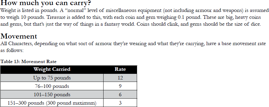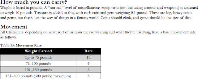 [10] Certainly one of the great gifts of the OSR, especially in its later period, has been an increased emphasis on layout, readability and usability, fully taking advantage of how the design of rulebooks has advanced and what desktop publishing software allows you to do compared to old-style (literal) cut-and-paste layout. There has also been an emphasis on writing in a way that cuts the fat, emphasizes key points, and properly organizes the flow of information. Old-School Essentials is probably the biggest recent example of a clean layout style here, with a heavy emphasis on bullet points and gradients in particular that has proven quite influential in a short period of time. My only quibble is that, if anything, there has been in some cases too much of an emphasis on reducing information, to the point that the negative effects of the "rules-light" phenomena have been somewhat mirrored in terms of text. In its worst examples we're seeing a sort of textual disintegration, where much of the potential flavour and atmosphere of a text that enthuses the reader and helps a DM understand the tone and environment is being sacrificed in the name of ruthless efficiency. While more focused on adventures than rulesets, Melan's excellent article "OSR Module O1: Against the Ultra-Minimalism" is definitely worth a read.